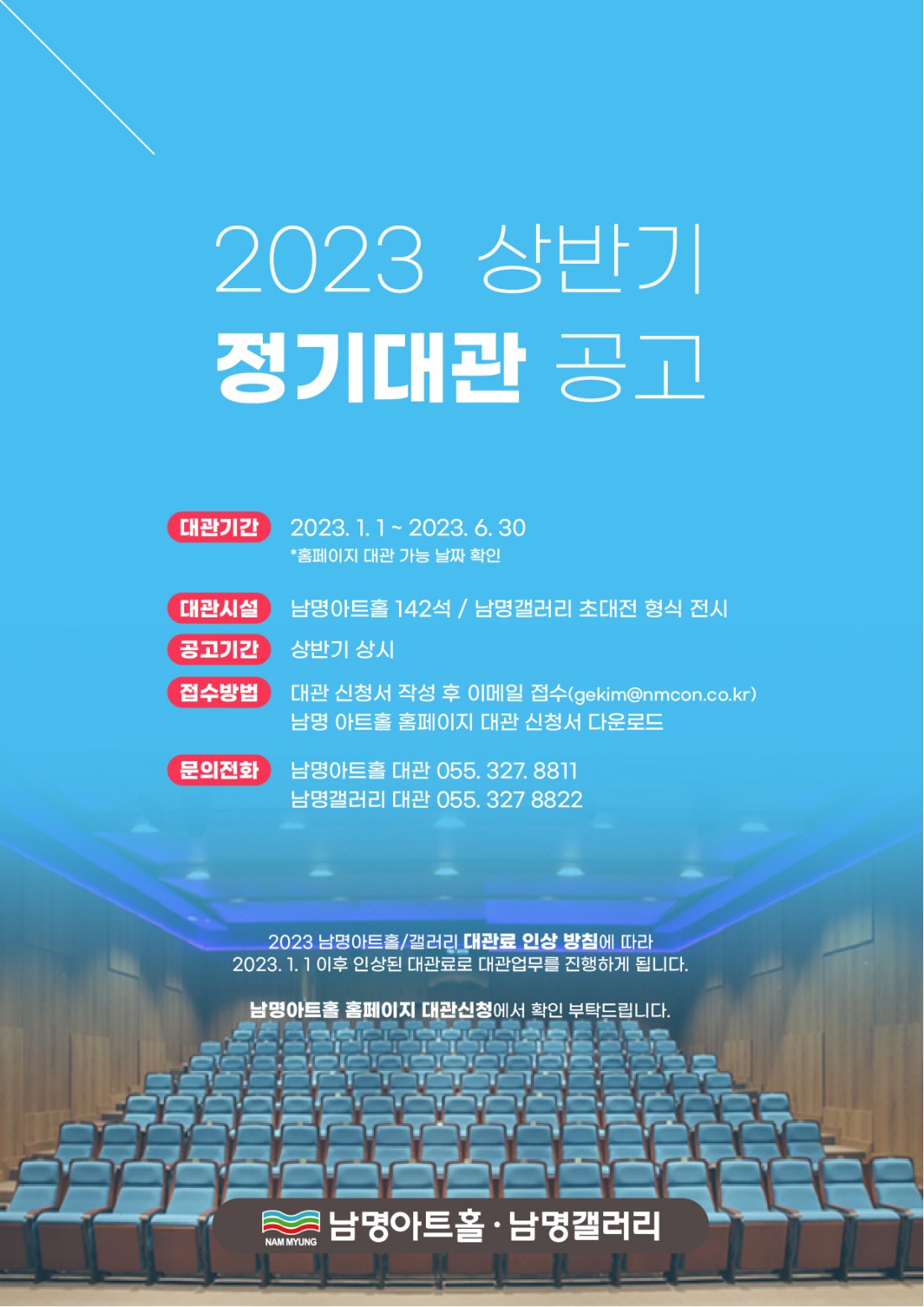 2023 남명아트홀 상반기 정기대관 공고 페이지 정보 작성자 관리자 조회1,137회 작성일 22-12-29 19:14 본문 남명아트홀 대관신청에서 확인 부탁드립니다. [이 게시물은 최고관리자님에 의해 2025-12-03 16:42:53 공지사항에서 이동 됨] 목록